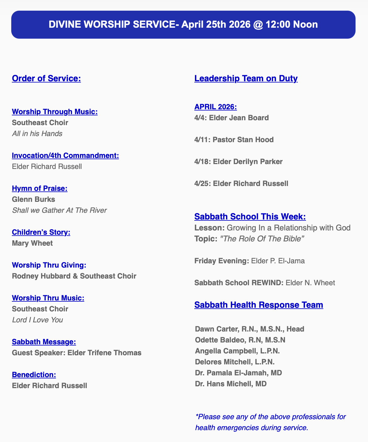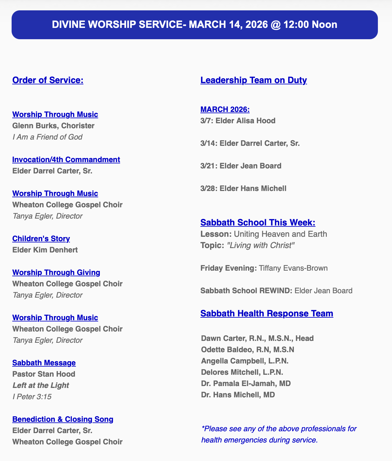 11am – Sabbath School Bible Study | 12pm – Worship Service