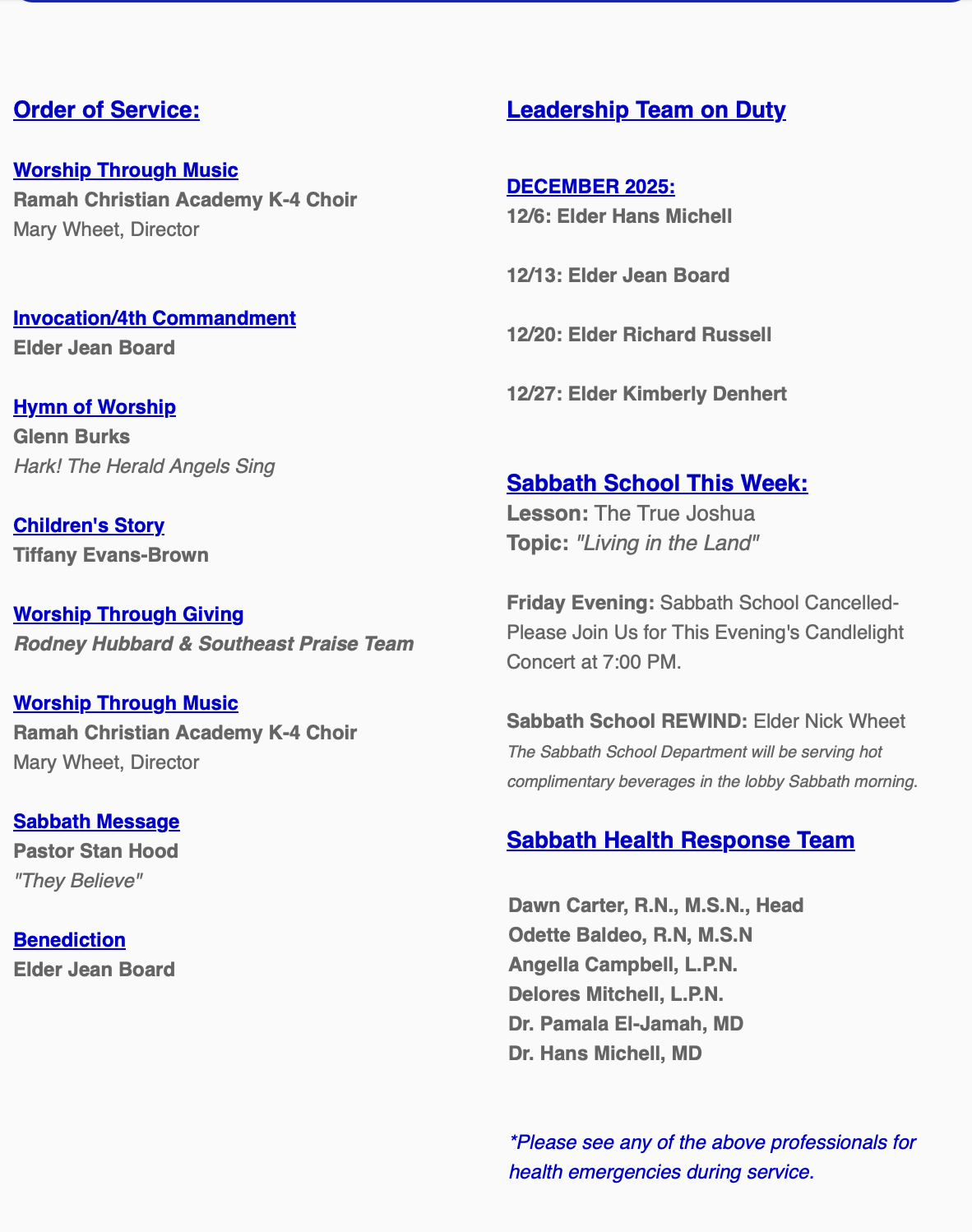 What’s Happening at Southeast SDA Church This Week? Announcements are updated here and in the e-bulletin with exciting news, programs, and events for the coming week! To receive the e-bulletin,…Read More
